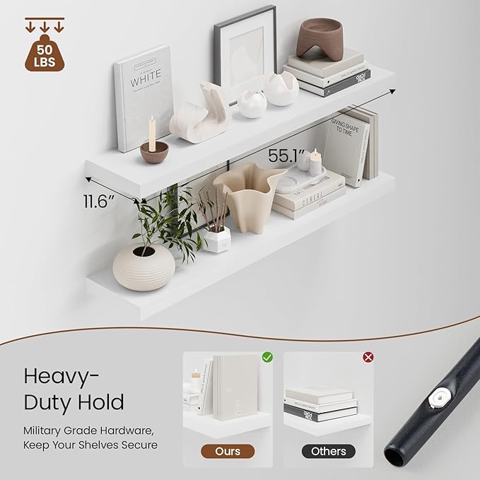 - Extra Deep Floating Shelves: Measuring 11.6” D x 55.1” W x 1.5” H, these shelves are crafted for maximum depth and durability. The spacious 12” depth gives you plenty of room for stylish display, organized storage, and decorative accents. Perfectly suited for your bathroom, kitchen, or living room, they enhance both function and flair in any space!