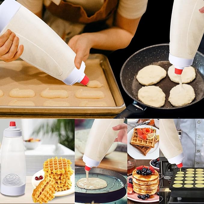 - SUPER LARGE CAPACITY: 1000ml large capacity, wire whisk batter bottle with accurate measurement marks, easy to mix; Pour batter into a prevent heatt pancake blender for quick and easy pancake design