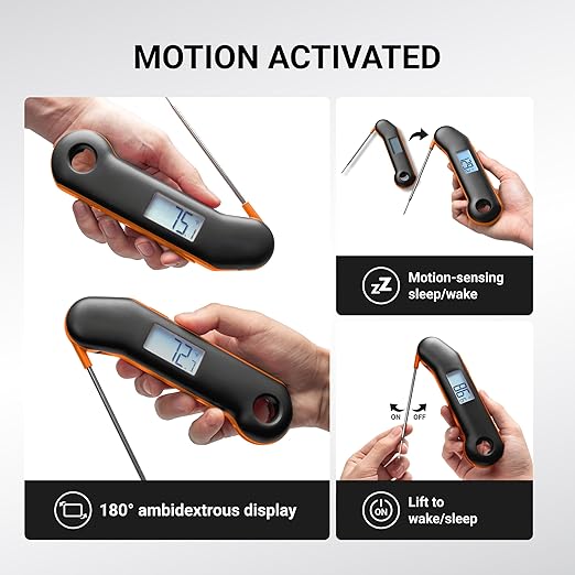 - Universal Design with Intelligent Functionality: Our digital thermometer features an ambidextrous, auto-rotating display for both right and left-handed cooks, ensuring effortless and inclusive use. It includes a smart sleep mode to save battery life and versatile storage options—hook or magnet—for a stylish, organized kitchen. Plus, with a built-in bottle opener, this thermometer is more than just a kitchen tool; it’s your essential companion for BBQs and gatherings.