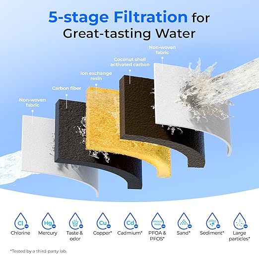 - [5-stage Filtration for Cleaner Water] This water filter pitcher adopts 5-stage filter materials including advanced carbon fiber, ion exchange resin and activated carbon block, and can efficiently reduce chlorine, mercury, taste&odor, copper, cadmium, PFOA&PFOS, sand, sediment and large particles, tested by a third-party lab, offering pure, refreshing water for you and your family. Note: This system DOES NOT lower TDS value.