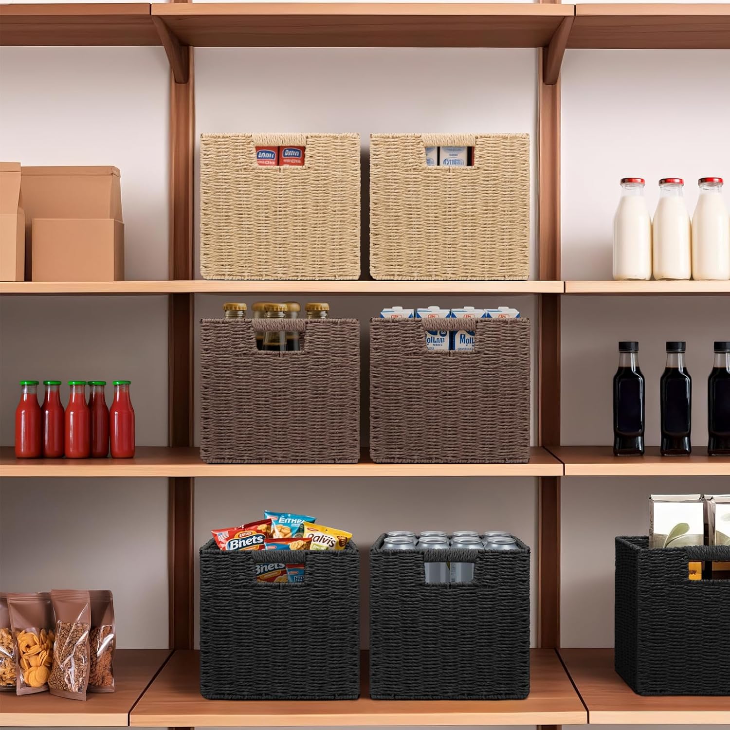 Wicker Storage Baskets for Organizing, 3 Pack Rustic Foldable Square Basket for Shelves, Handwoven Cubby Organizer Bins for Home Decor, Small Cube Storage Bin for Closet Organization (Black 11 inch)