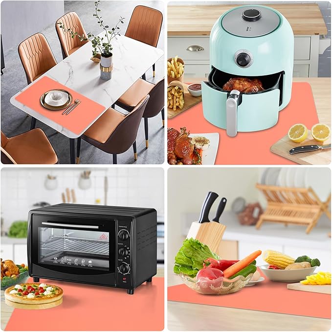 - Non stick & Anti-slip silicone kitchen mat: Different texture design on two sides, non-stick surface are perfect for baking or other food preparing, while non slip bottom adheres strongly and provides great non-slip grip to keep appliances from sliding around, avoiding accidents for daily use.