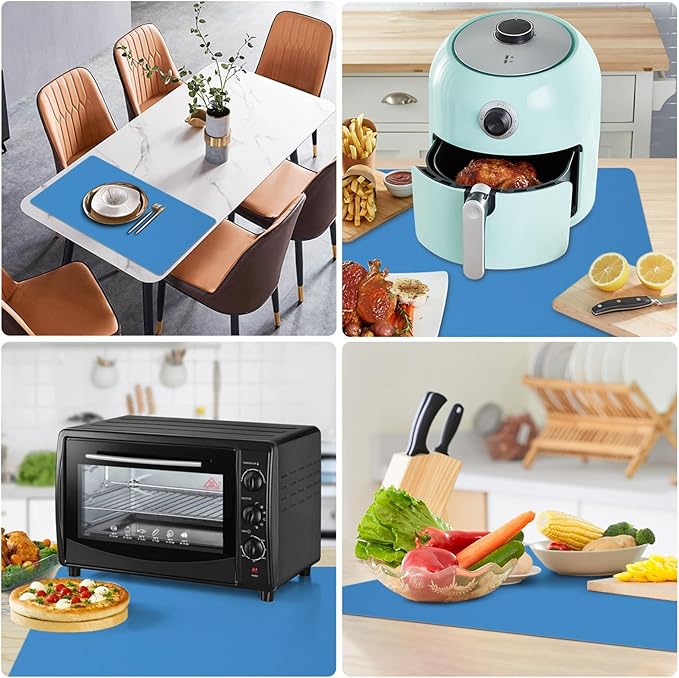 - Non stick & Anti-slip silicone kitchen mat: Different texture design on two sides, non-stick surface are perfect for baking or other food preparing, while non slip bottom adheres strongly and provides great non-slip grip to keep appliances from sliding around, avoiding accidents for daily use.