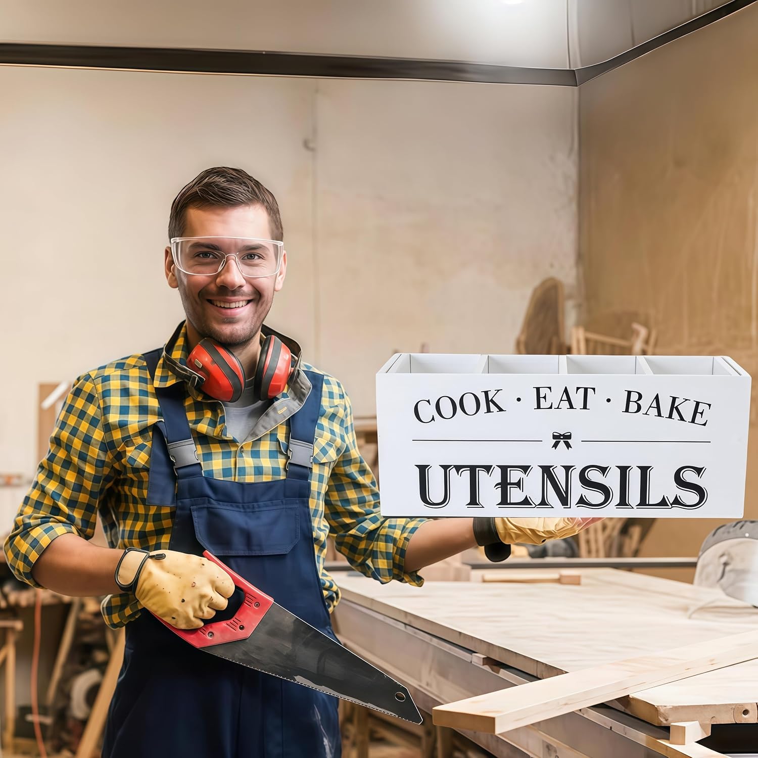 Utensil Holder,Extra Large Wooden Utensil Holder For Kitchen Counter,Cooking Spatula Organizer,Big Storage Caddy With 4 Compartments Flatware Spoon Tool Cutlery(White)