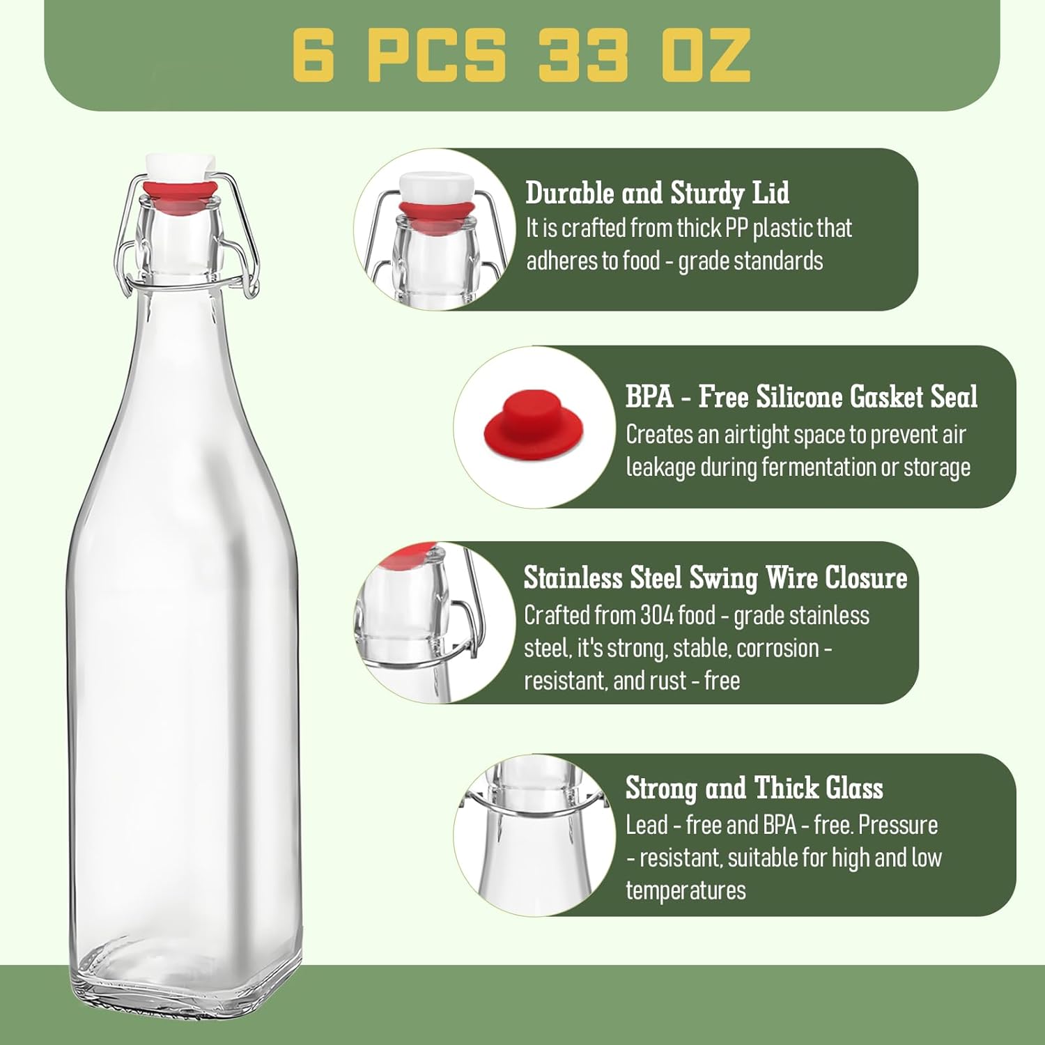 6 Pack [1 Liter / 33 fl. oz.] Square Swing Top Glass Bottles–Airtight Flip Top Brewing Bottles for Kombucha, Beer, Wine, Kefir, Soda, Liquor–Includes Funnel, 2 Pourers, 6 Seals, 8 Labels & Jute Twine