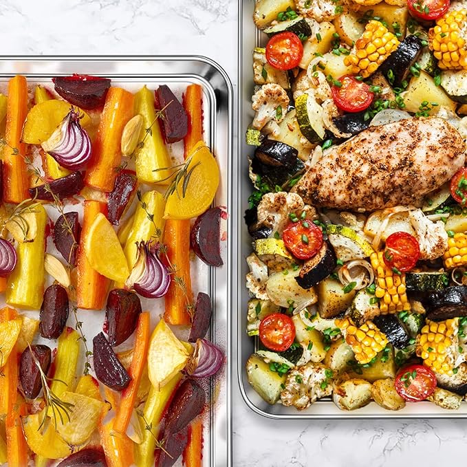 - Versatile baking, 18 x 13 x 1 inch half sheet pans fit most regular toaster ovens, large flat baking cookie tray great for sweet or savory baking, perfect for cooking delicious dinner meals, roasting chicken, steak, baking cookies, sheet cake, pizza and more, also can be used as serving tray