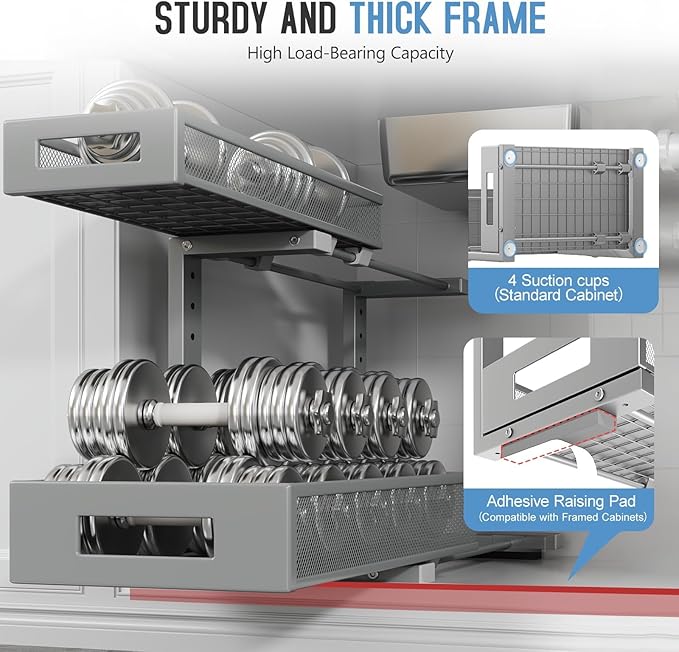 - 【2-Tier Pull-Out Design for Easy Access】This under-sink organizer features a double-layer pull-out design, allowing you to easily access items at the deepest part. The upgraded, thickened iron circular sliding rails ensure a smooth and seamless pulling experience, making each use effortless. The unique pull-out locking mechanism effectively prevents the drawers from being completely pulled out, avoiding the risk of items falling or structural damage caused by over-pulling, ensuring safer.