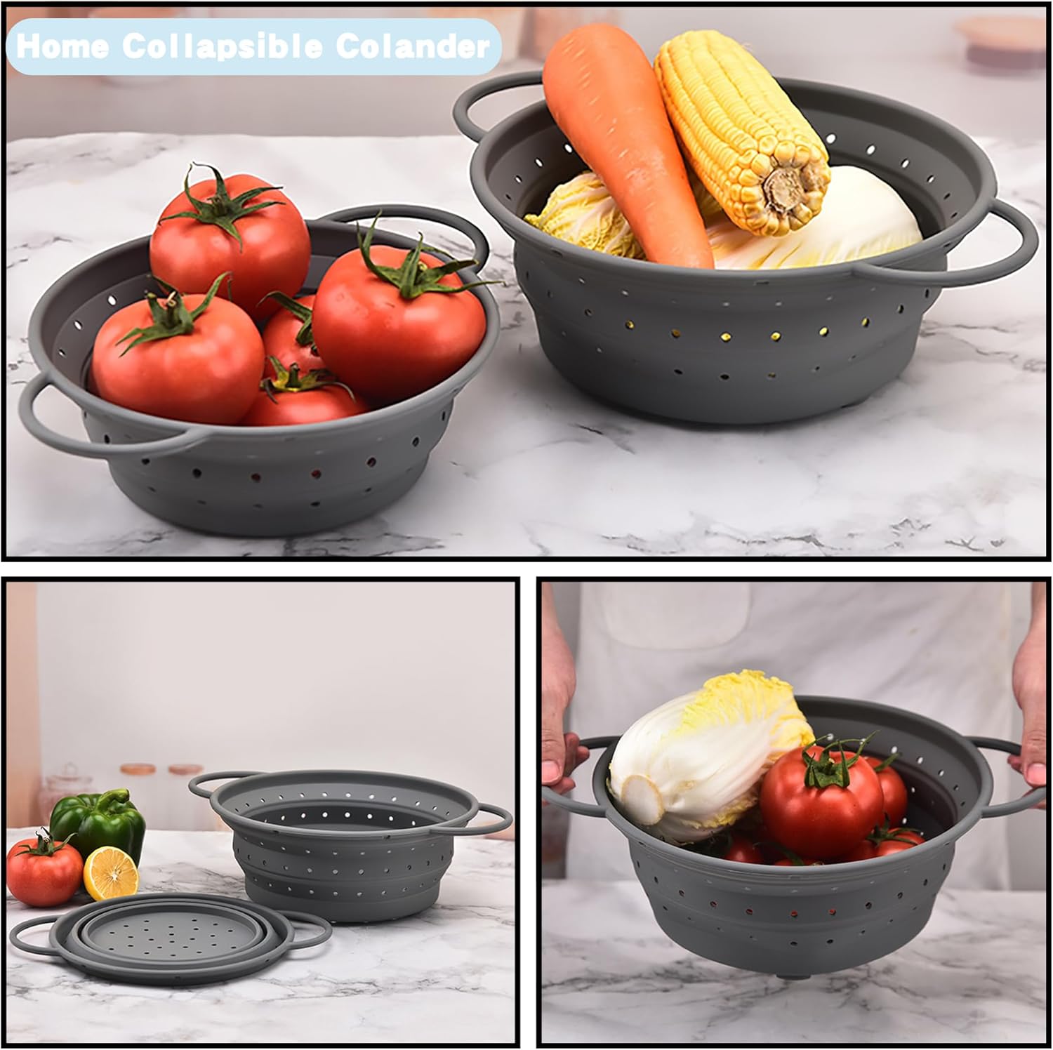 - 【Multi Purpose Silicone Colander】Silicone kitchen colander is perfect for fruit and vegetable draining tools,Our silicone colander are heat-resistant up to 390 °F / 200°C(No contact with open flames/sharp knives)