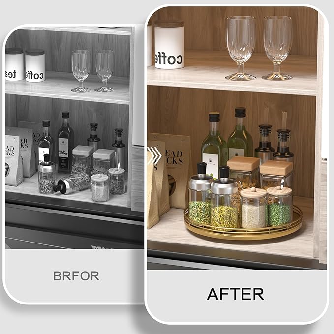 - Thoughtful Design: The turntable gold tray features a smooth and silent 360°rotation; Bottom slip-resistant pads for stability and protect your countertop from scratches; Raised edges on each organizer tray to keep items from falling out; Easy to use, no installation required