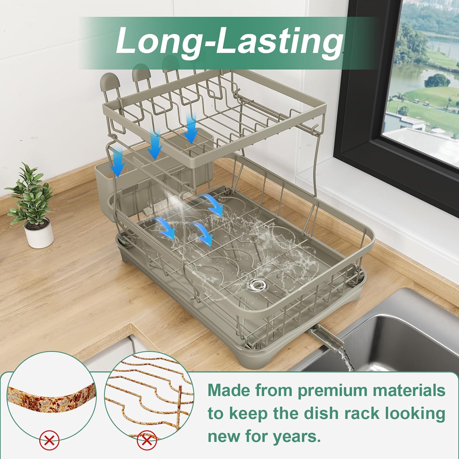 - Intelligent Drainage: Equipped with a central drain hole and adjustable nozzle system to ensure that water is accurately directed into the sink rather than the countertop, and the bottom non-slip feet use L-shaped reinforcement structure to maintain stability and no leakage when fully loaded, keeping the kitchen dry and clean