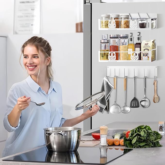 - Perfect Small Space Organization:This magnetic spice rack for refrigerator is the ultimate space-saving solution! Free up your countertops and cabinets while keeping your spices, oils, and kitchen gadgets neatly stored. Designed with 1 separate magnetic hook rack and 2 extra cute magnetic shelves, this organizer is a must-have for home and kitchen