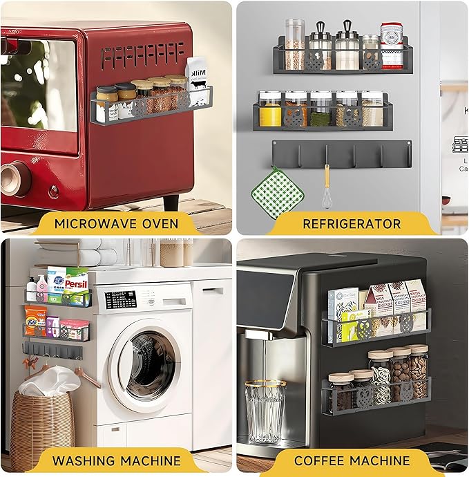 - Simple,Tool Free Installation:No assembly needed,Just attach the magnetic storage for refrigerator to any metallic surface for an instant kitchen shelf organizer. Whether placed on the fridge, microwave, or washing machine, it’s an effortless storage solution