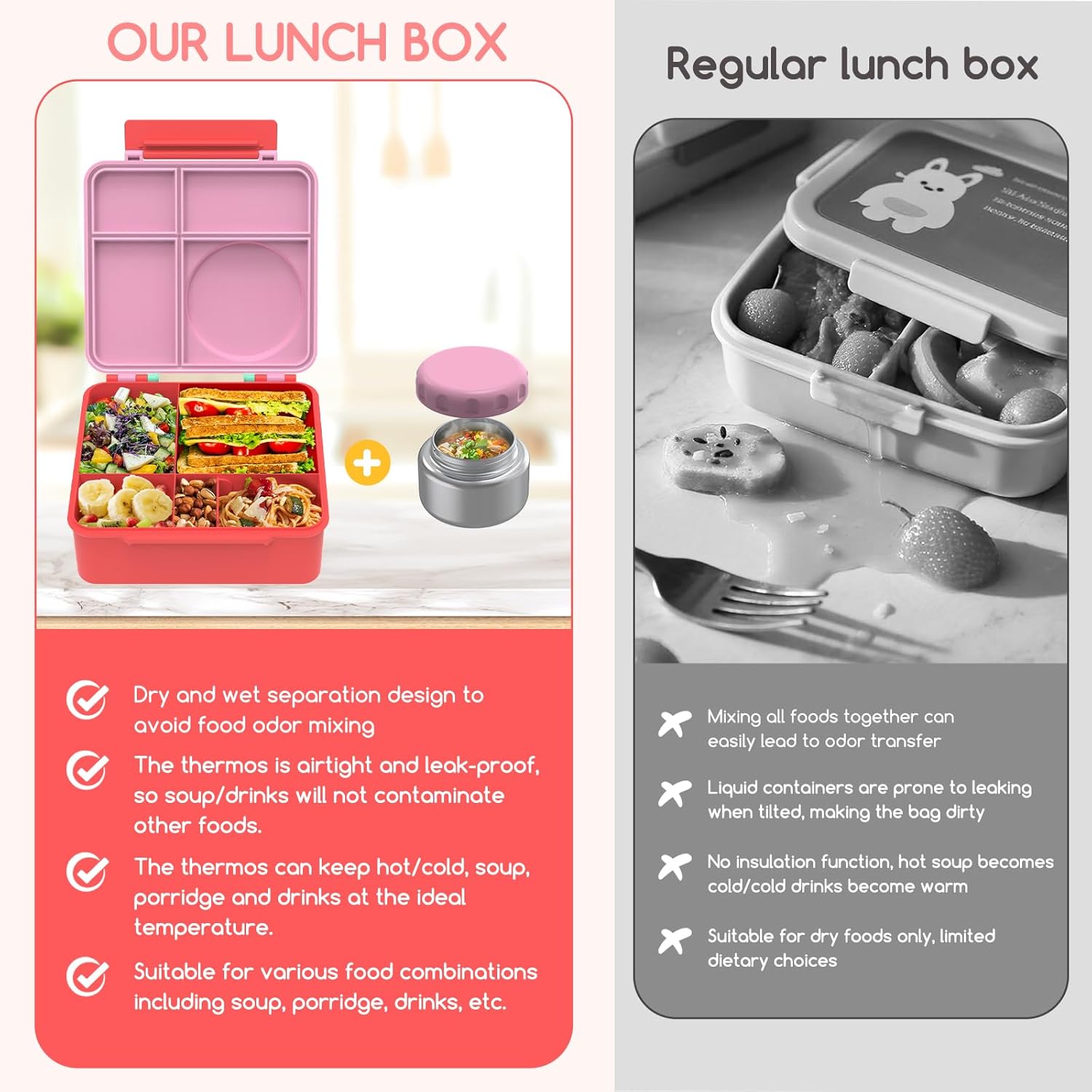 - 100% Leak-Proof: Our lunch box lid uses a silicone seal to seamlessly fit the edges of each compartment, so that no odors can mix or transfer between compartments. Hot soup/cold drinks can be stored separately in the thermos, and say goodbye to the messy backpack caused by spilled food.