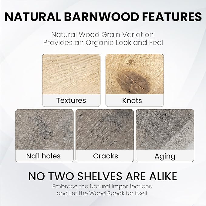 - Thick Reclaimed Wood Shelves: Fun Memories floating shelves are handcrafted from 1.4" thick solid reclaimed wood, measuring 55" x 8". Natural barnwood features—such as nail holes, discoloration, and surface wear—make each shelf a one-of-a-kind, authentic décor accent