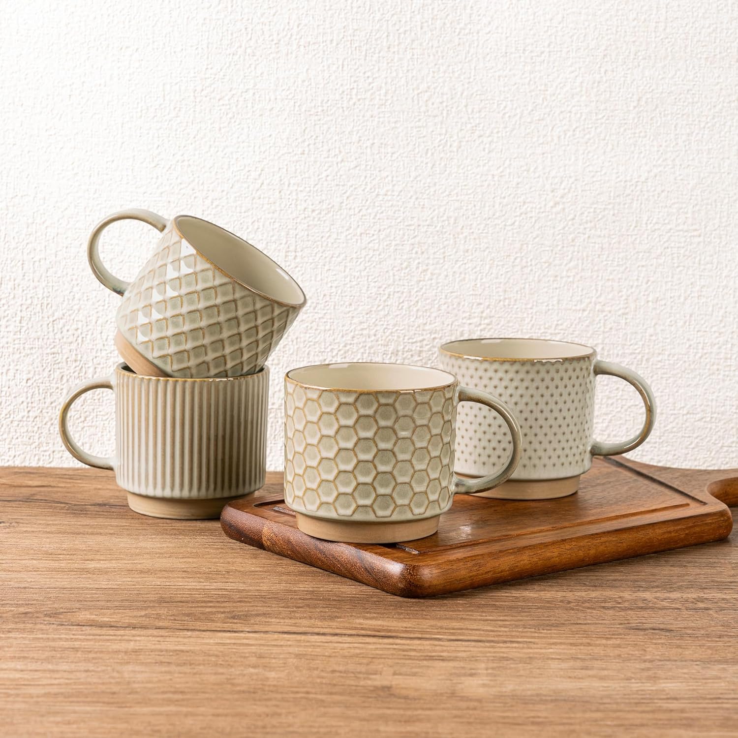 - Stackable and Modern Design: These ceramic mugs feature a beautiful embossed texture design, the smooth rim ensures a comfortable drinking experience, the stackable design allows for easy storage and helps save space in your kitchen.