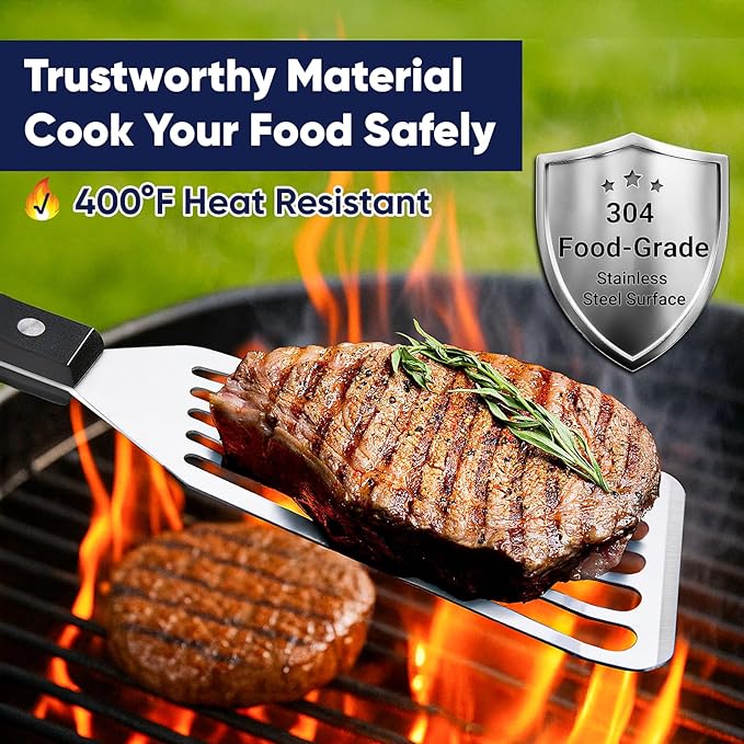 - Holds Hefty Food with Ease β our metal turner can be used at barbecue party to make burgers on an outdoor grill as it can easily hold the weight of a half-pound patty
