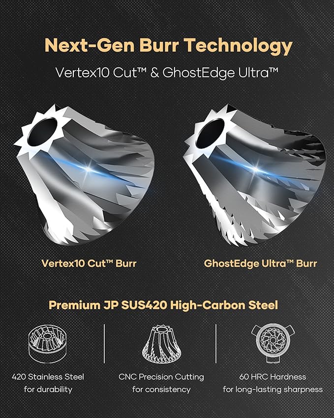 - GhostEdge Ultra Burrs - Engineered with 120 micro-serrated teeth, our GhostEdge Ultra burrs extract unmatched clarity, sweetness, and body—because every great cup starts here.