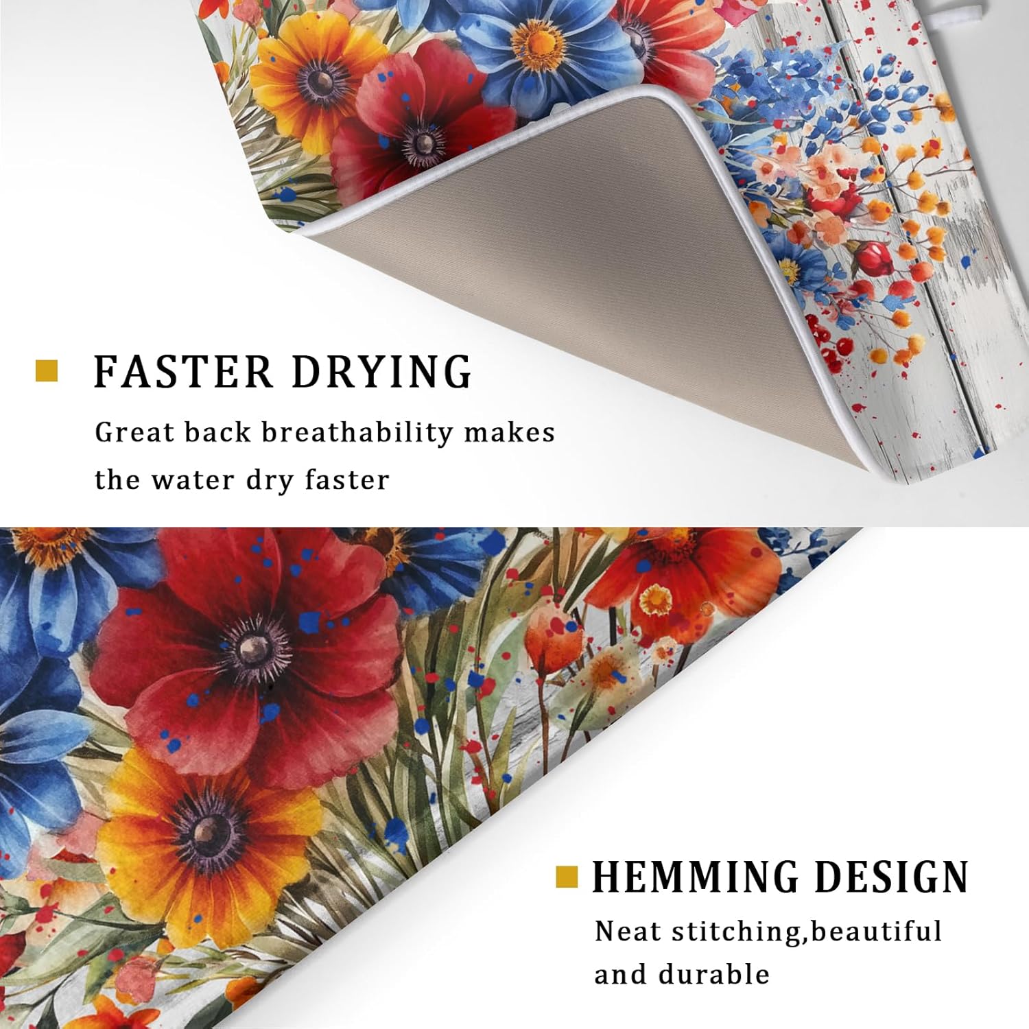 4th of July Dish Drying Mat 18x24 inch Patriotic Floral Fast Dry Microfiber Reversible Dish Drainer Rack Pad Kitchen Counter Accessories