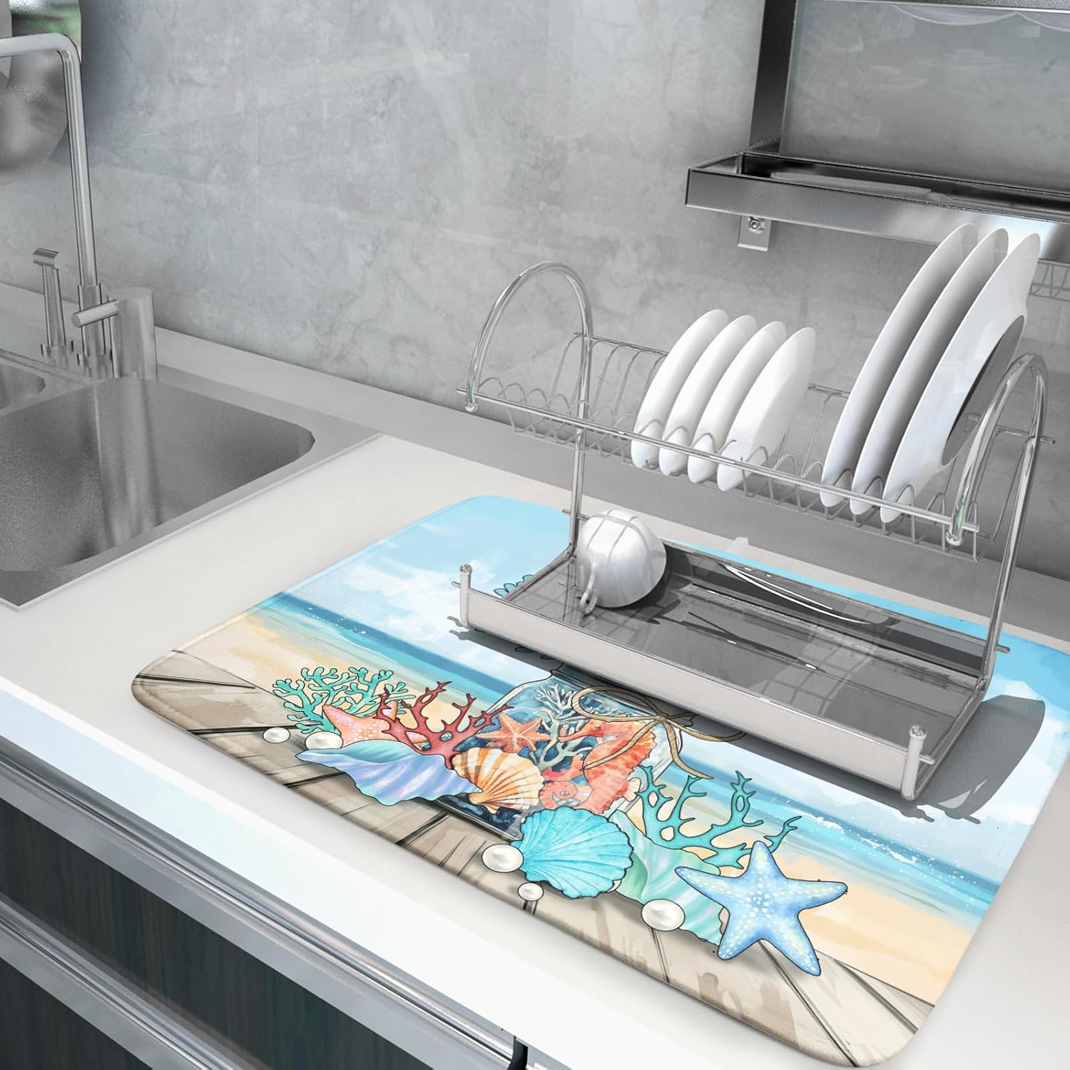 - 【Wide Usage】The dish drying mat designed with beach conch pattern, it is beautiful, soft, and durable. Not only a dish drying mat, cup mat, heat resistant mat, you can also use it as a kitchen countertop insulation mat. It is also a good choice to use it as a pet mat, picnic mat.