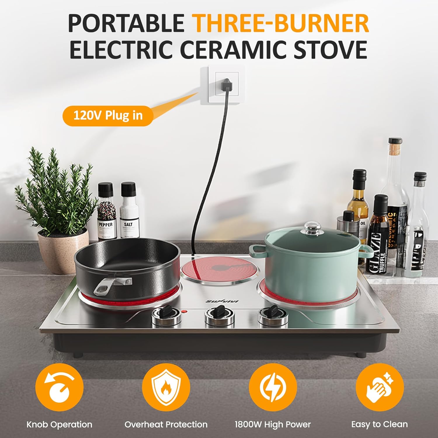 Sunvivi 1800W Triple Burner Portable Electric Ceramic Stove – Knob Control, Indicator Light, Compatible with All Cookware, Ideal for Multiple Cooking Scenarios, Silver