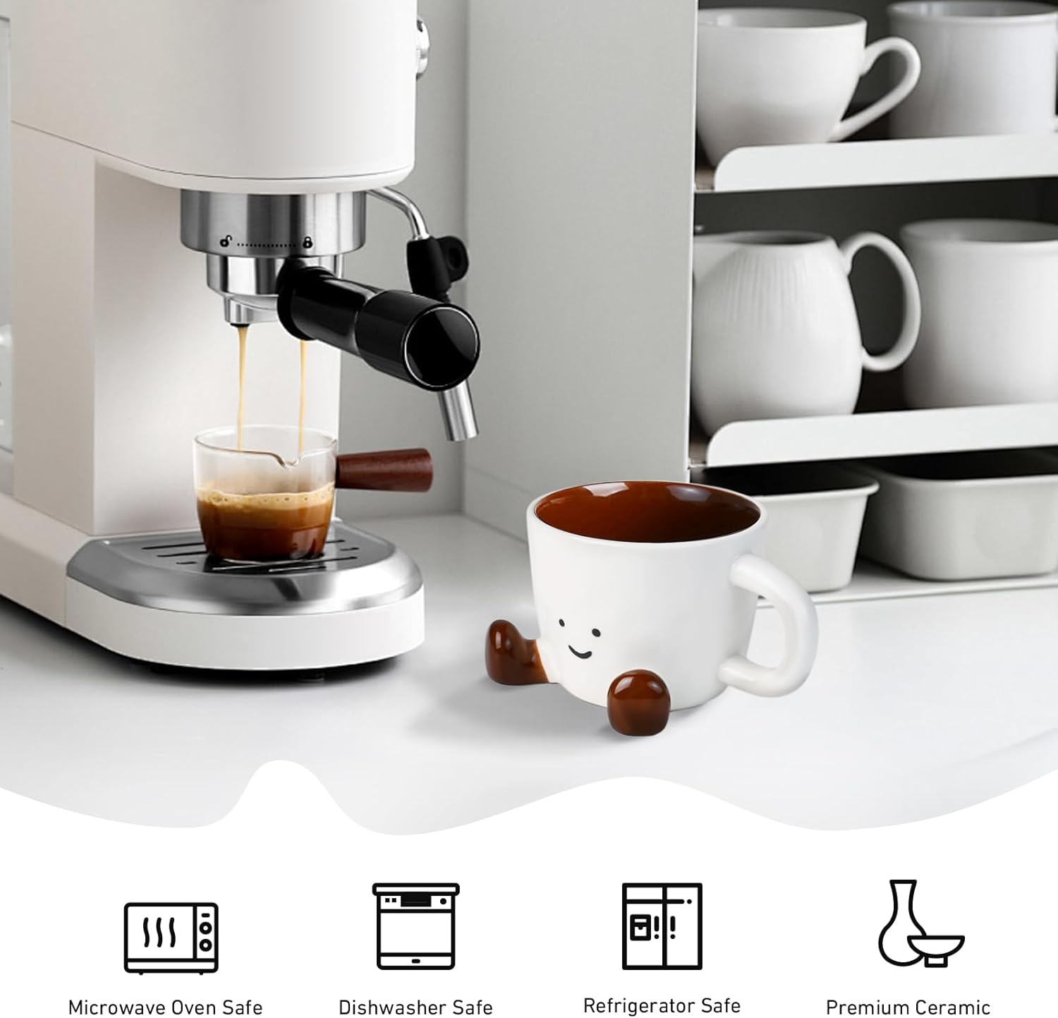 - INTERESTING STYLING: Cute funny Coffee Mug with Smiling Face and Lil Feet. Creative, cute design stimulates your imagination and inspires you to start the day well