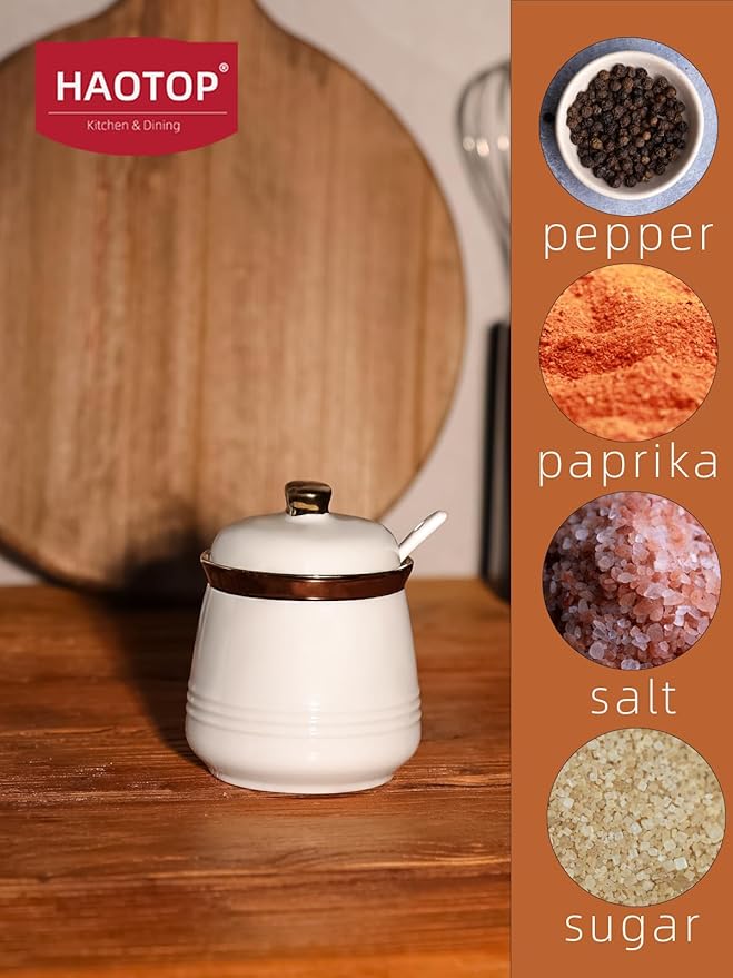 - DESIGN CONCEPT: This simple sugar bowl is equipped with a lid and a small spoon. The lid can keep your ingredients away from dust. There is a perfect notch on the lid for placing the spoon, so you don’t have to worry about placing the spoon randomly