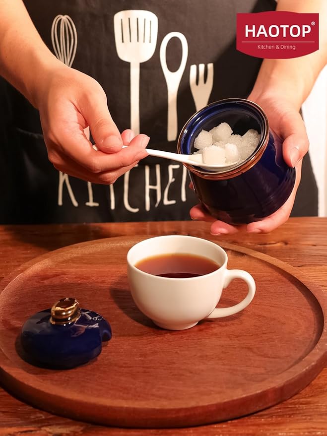HAOTOP 12oz Sugar Bowl with Lid and Spoon,Simple Ceramic Sugar Jar Sugar Container Sugar Dispenser Coffee Bar Accessories, Modern Kitchen Countertop Canisters (Navy)