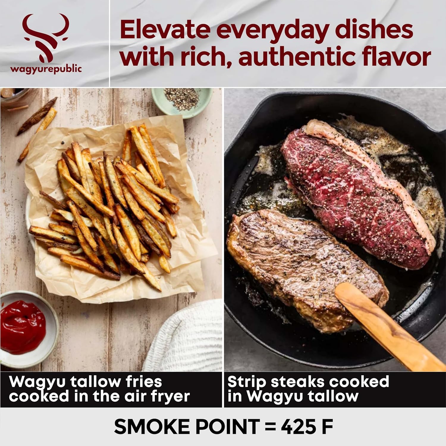 - WAGYU REPUBLIC BEEF TALLOW (28oz) — Elevate snacks and meals with the subtle rich flavor and smooth texture of Wagyu tallow. Perfect for Tomahawk steaks, ground chicken, even pie crusts.