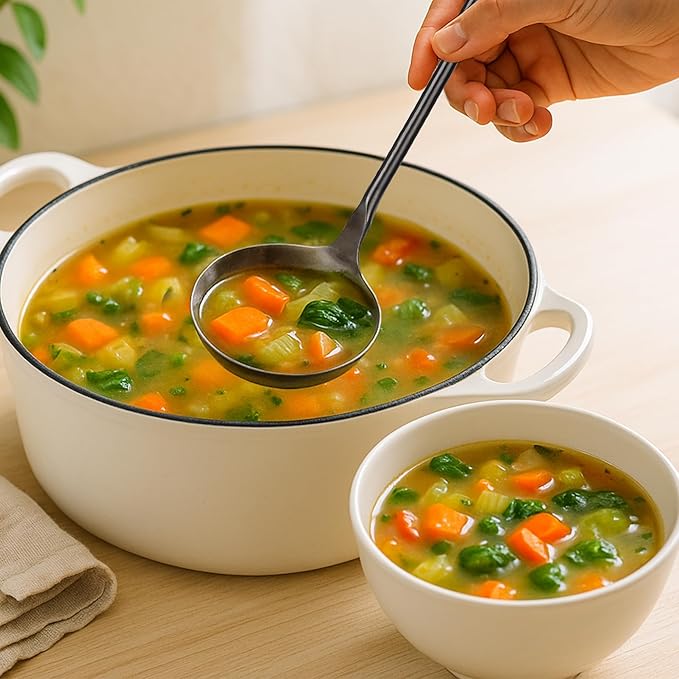 - Deep Bowl for Efficient Serving: Features a generously sized, polished bowl to scoop and pour liquids smoothly, reducing spills and making the stainless steel ladle ideal for large pots, stockpots, or serving dishes.