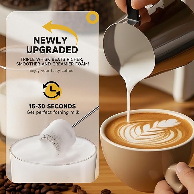 Electric Milk Frother Handheld, Triple-whisk 3-Speed Coffee Drink Mixer with 3 Stainless Steel Whisks (Including Triple-Spring Frothing Whisk) – Stand Included for Cappuccino, Latte, Egg Whisking