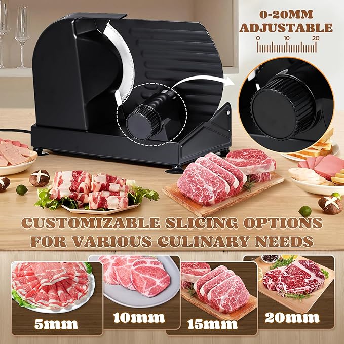 - 1-20mm Adjustable Thickness With the convenient large adjustment knob on the back of the deli slicer, you can effortlessly set your desired slicing thickness, ranging from 1 to 20mm. Customize your slices to perfectly fit any recipe and achieve professional-quality results right in your own kitchen. Enjoy the convenience and precision for every dish.