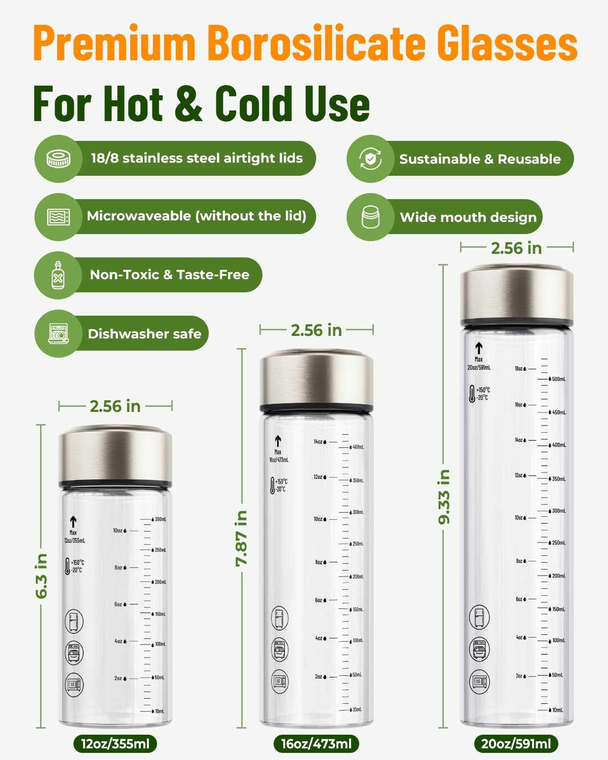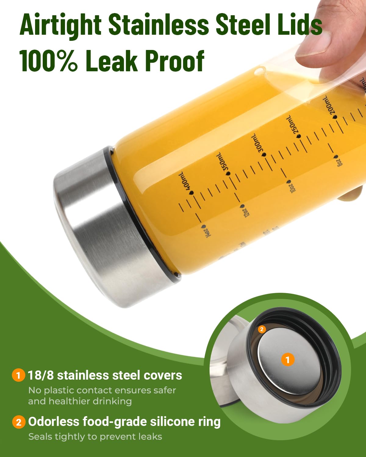 - GLASS WATER BOTTLES WITH MEASUREMENT MARKER: Durable stainless steel lids with air and water-tight seals, so it is completely airtight to keep your beverage fresh without any worry of spills. Throw this glass water bottle in your bag or car and get a healthy start to your day with a juice, brew, ice tea, iced coffee, nut milk, milkshakes, kombucha or protein. The clear glass helps you quickly spot the drink you're in the mood for.