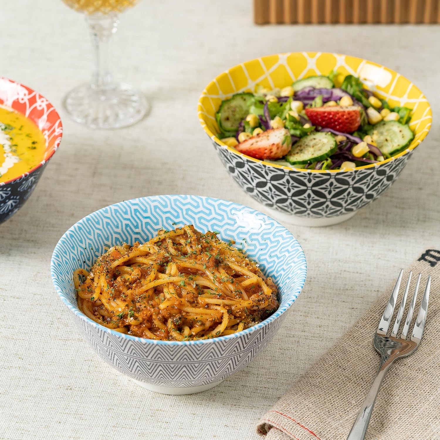 - Vibrant & Versatile Bohemian Bowls——Elevate your dining experience with this stunning set of 6-inch Bohemian-style ceramic bowls. Each bowl features a unique, hand-painted design in rich, eye-catching colors—red, yellow, deep blue, and sky blue—making them a beautiful addition to any kitchen or table setting. Perfect for cereals, salads, soups, fruits, yogurt, pasta, and more, these bowls combine artistry with everyday functionality.