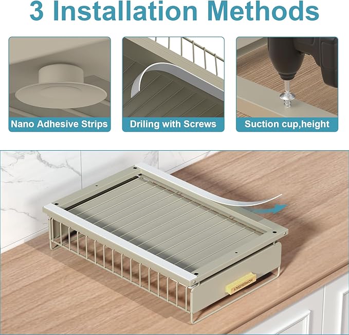 - Multiple Installation Designs: Kitchen storage and organization adopts three innovative (suction cup/double-sided tape/screw hole) fixing designs, suitable for tile/wood/metal surfaces. Under sink organizers and storage can be installed in just 5 minutes