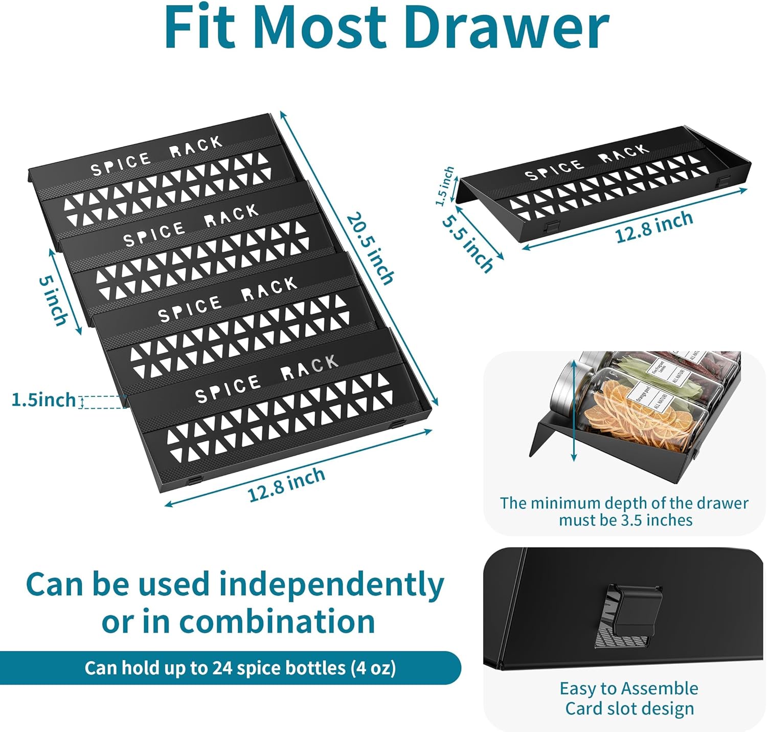 - Large Capacity Design & Individual Use: This 4-tier spice drawer organizer has a large capacity design, each tier can neatly arrange 6 spice jars (4 oz). Meet your diversified storage needs. Each layer can be used independently, whether it is a wide range of spices and seasonings in the kitchen, or all kinds of small bottles of cosmetics on the makeup table, can be easily stored in it, so that your space has become organized, no longer have to worry about not finding things.