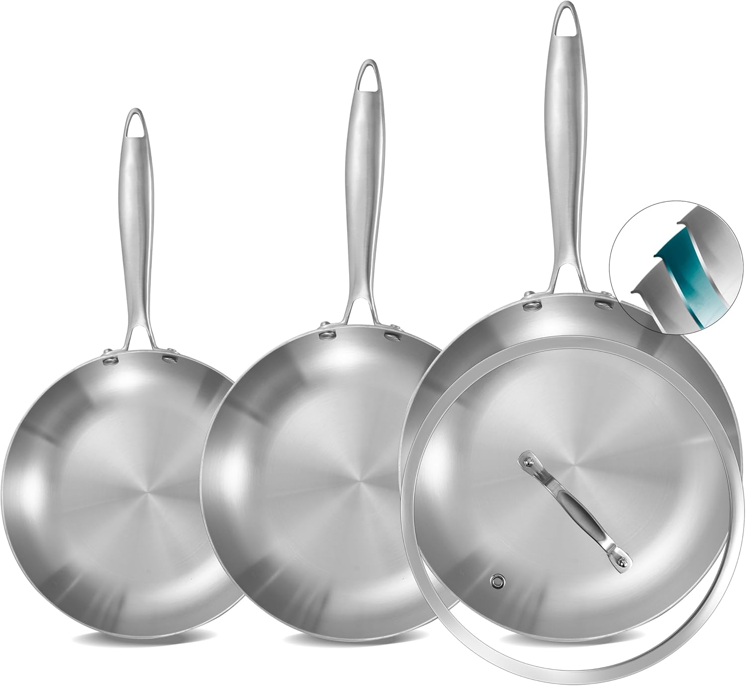 Inqibee Tri-Ply Stainless Steel Frying Pan Set of 3 with Lid,Skillets,Induction Cooking Pans Set,Riveted Handle,Eevn Heating and Oven Safe,8-9.5-11 Inch