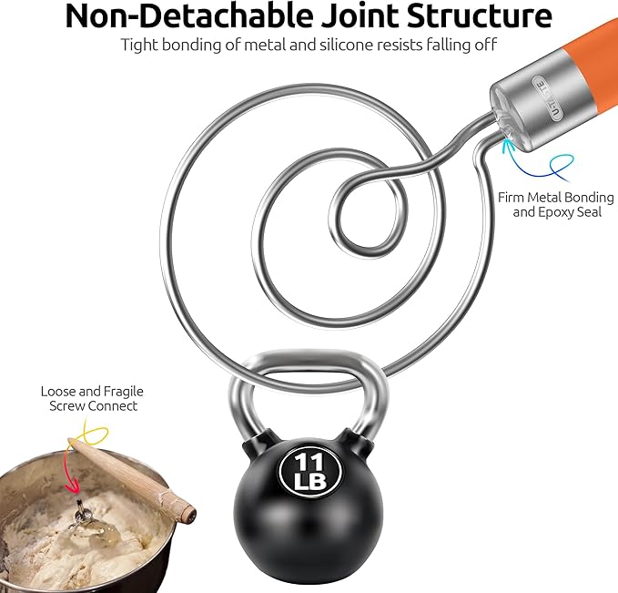 - [Heavy Duty Ergonomic 8.6in Long Handle] Are you still worried about your blender's mixing head falling off wooden handle? Compared to others’ wood handle, U-Taste’ sourdough whisk chooses silicone handle, which bonds more firmly to the stainless steel, offers comfortable, non-slip grip, allows long-lasting and heat-resistant use. No more breaking, falling off or food safe issues. 8.6in long keeps your hands clean from sticky dough. 0.95in wide allows mix heavy doughs without hand fatigue.
