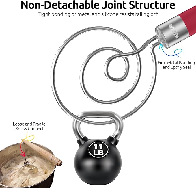 - [Heavy Duty Ergonomic 8.6in Long Handle] Are you still worried about your blender's mixing head falling off wooden handle? Compared to others’ wood handle, U-Taste’ sourdough whisk chooses silicone handle, which bonds more firmly to the stainless steel, offers comfortable, non-slip grip, allows long-lasting and heat-resistant use. No more breaking, falling off or food safe issues. 8.6in long keeps your hands clean from sticky dough. 0.95in wide allows mix heavy doughs without hand fatigue.
