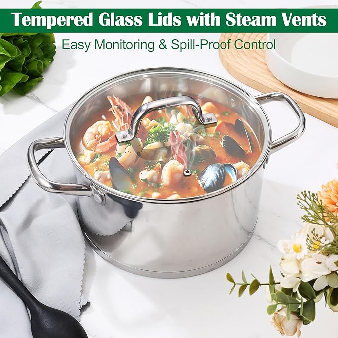 - GLASS LID & GIFT-READY: Thick Tempered glass lids enable visual monitoring without lifting lids and lock in moisture and flavor, A steam vent hole release excess steam to prevent spills, Sleek minimalist look fits any kitchen style, Great for newlyweds & housewarming gifts
