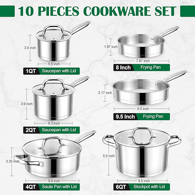 - VERSATILE COOKWARE SET: Our 10-piece set includes 1qt saucepan with lid, 2qt sauce pan with lid, 6qt stockpot with lid, 7.87’’ frying pan, 9.5’’ frying pan, 4qt saute pan with lid, Handle all kitchen tasks, Including boiling, braising, steaming and simmering