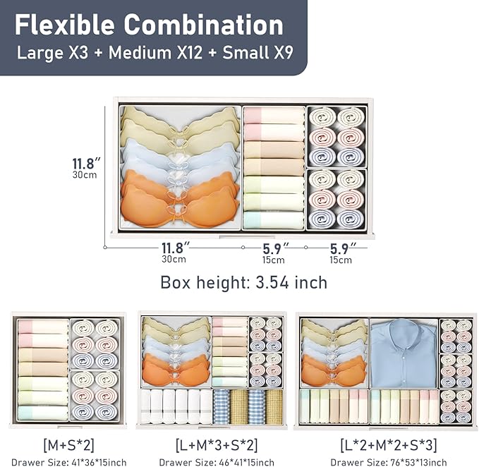 - Free Combination: This drawer organizer clothes set includes 3 large square boxes (11.8"x11.8"x3.54"), 11 medium containers (11.8"x5.9"x3.54") and 6 small bins (5.9"x5.9"x3.54"). A variety of sizes can be flexibly combined to meet different storage needs. The small drawer organizer can be freely configured in wardrobes and other spaces to achieve efficient and personalized classification and organization