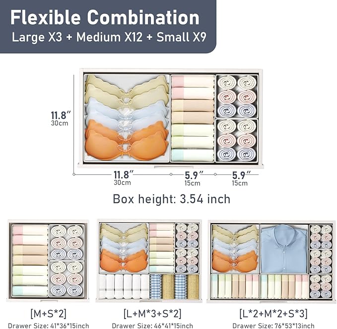 - Versatile Storage Solutions:Our drawer storage is suitable for various storage scenes such as wardrobe, bedroom, shelf, etc.These large organizer drawer storage can store bras, underwear,etc. The medium clothes organizer sock drawer organizer can store briefs,scarves, yoga trousers, socks,cosmetics etc.The smaller dresser drawer organizer clothes can store smaller accessories such as ties, office supplies