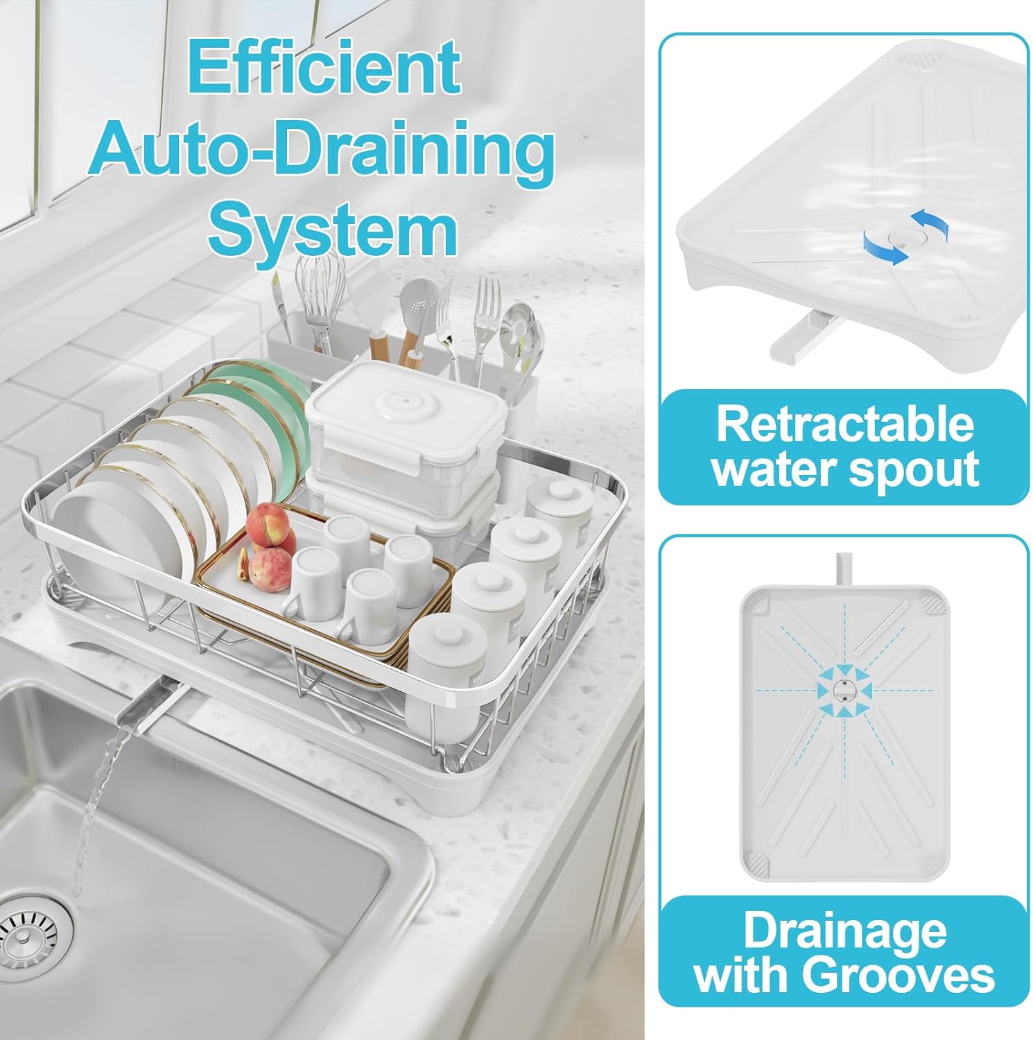 - Auto - draining Drainboard :Featuring central drainage holes and adjustable spout, the dish drying rack ensures that water drains directly into the sink, keeping your countertop dry. You can position the rack adjacent to the sink in the most convenient way for your setup.