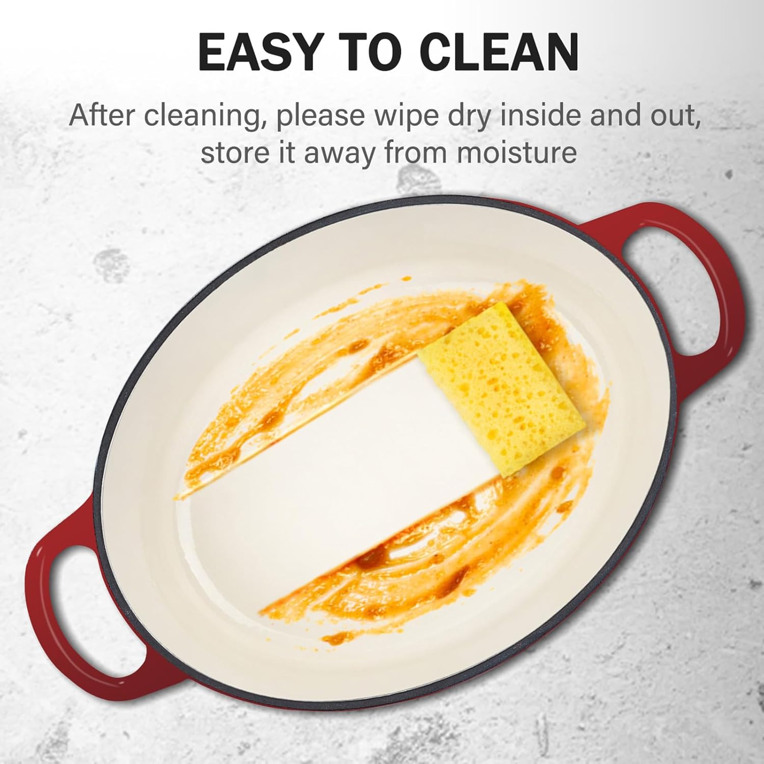 - Oval Dutch Oven Pot with Lid: Enameled cast iron oval dutch oven casserole dish pot with lid is made of cast iron and covered with heavy-duty enamel to avoid chipping. The design of white non-stick enamel interior is engineered to ward off dulling and staining. This oval dutch oven does not need to be seasoned in advance, so it is very suitable for healthy cooking without safety worries