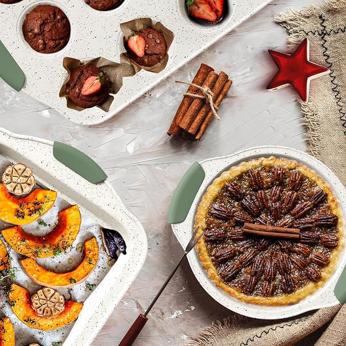 11-Piece Non-Toxic Baking Set, Stackable Nonstick Cookware with Heat-Resistant Handles - Includes Cookie Tray, Round Cake Pan, Muffin Cups, Pizza Pan & Loaf Baker, White&Light Green