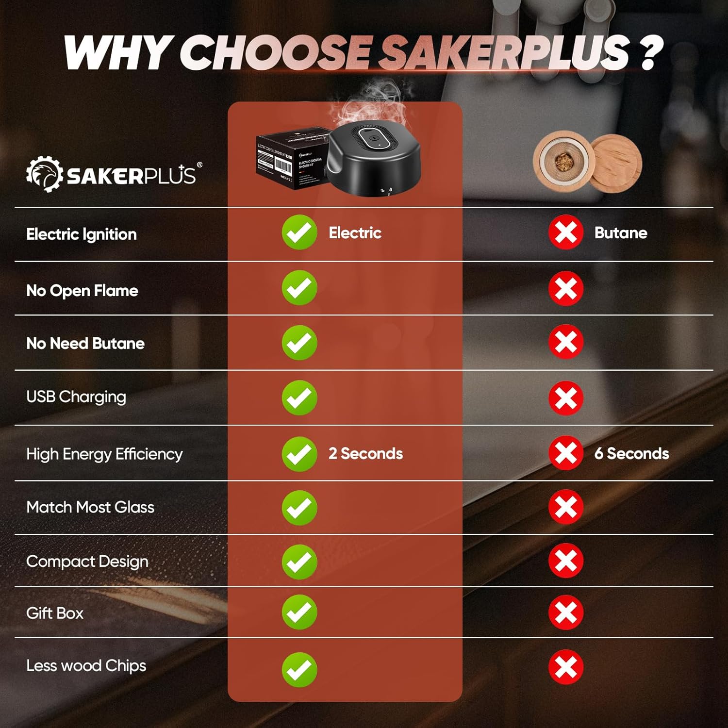 - 【BUTANE-FREE ELECTRIC SMOKER】No butane needed! SakerPlus advanced whiskey smoker kit features a revolutionary electric ignition system - simply USB charge for 60+ smoking sessions per power-up. The intuitive one-button operation delivers effortless control, eliminating messy fuel forever. Enjoy safer, cleaner smoking with consistent performance - no open flames, no hazardous fuels, just premium flavor enhancement at your fingertips.