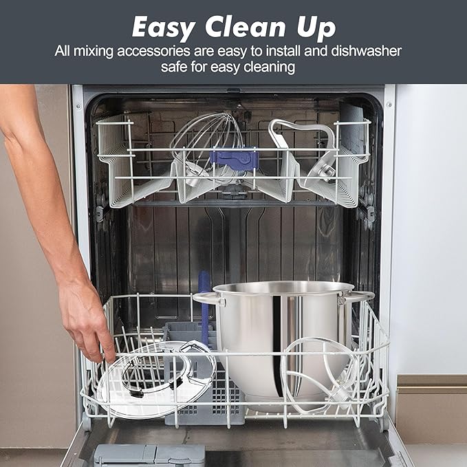 - Multiple Attachment Set - Aucma stand mixer comes with three upgraded mixing accessories: whisk, dough hook, mixing beater which are all dishwasher safe.The splash guard with access hatch helps add ingredients without making a mess.