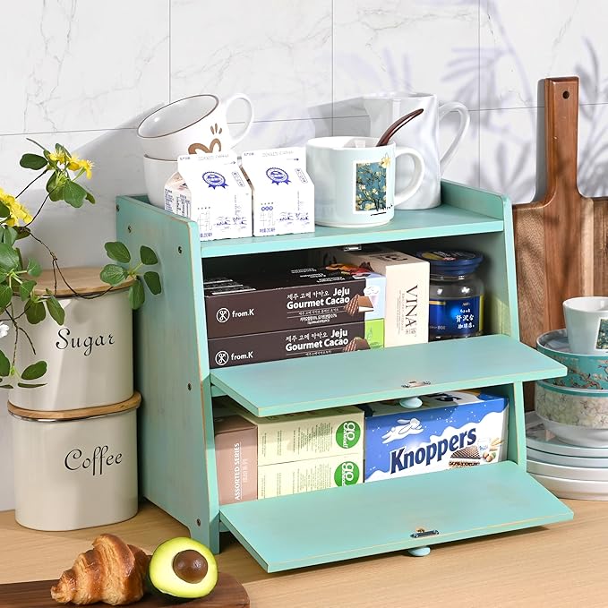 - Large Capacity: The two layers pantry organizers and storage measures 15.7*9.8*12.6 inches, the unique double bamboo panel divider design of the pantry organizer provides two separate bread storage spaces, each with its own doors, ensuring that the bread flavors never clash. you can store different flavors of bread separately in the bread holder for kitchen counter, such as long bread, loaves of bread, sandwiches, hamburgers, rolls, muffins, Hawaiian bread, bagels, crepes, etc.