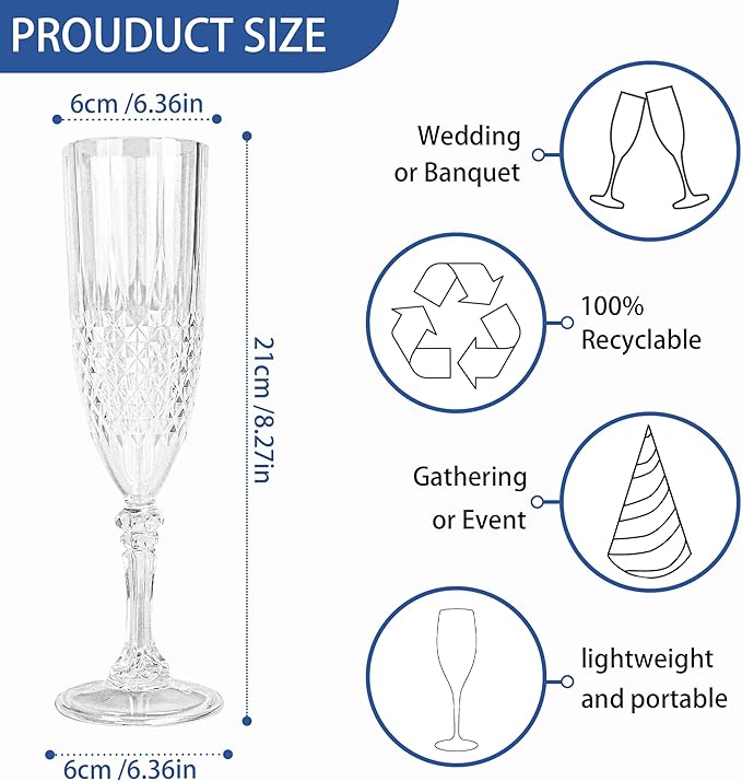- Charming Set: Champagne flutes set include 48 retro-style transparent champagne plastic wine glasses, providing ample quantity to meet your daily use and replacement needs. A suitable champagne cup is the icing on the cake. Plastic wine glasses not only carry the wine, but also carries the laughter and blessings