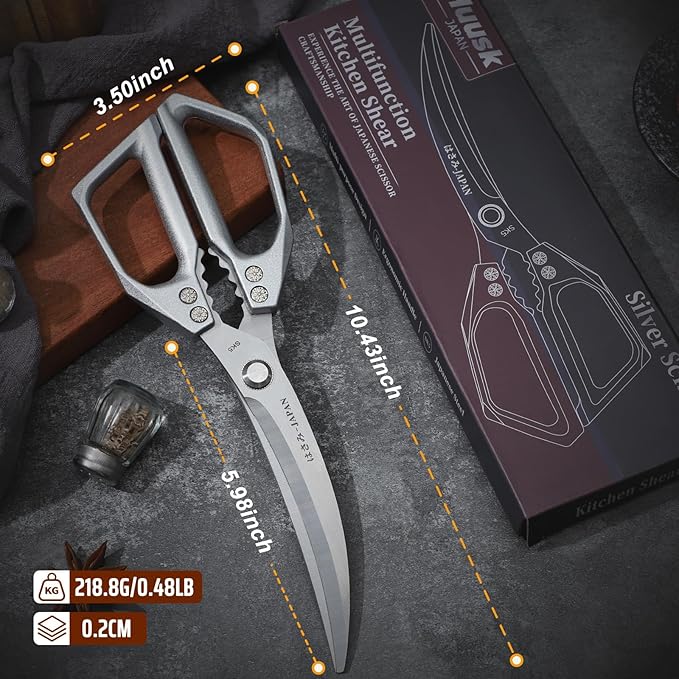 - 【Japanese Craftsmanship, BBQ Shear Excellence】Forged with Japan’s centuries-old metalworking mastery, HUUSK’s kitchen shears slice through ribs, cartilage, and tough meats with razor-sharp precision. The gleaming silver blades combine rugged durability with refined artistry—perfect for grilling masters who demand both power and finesse.
